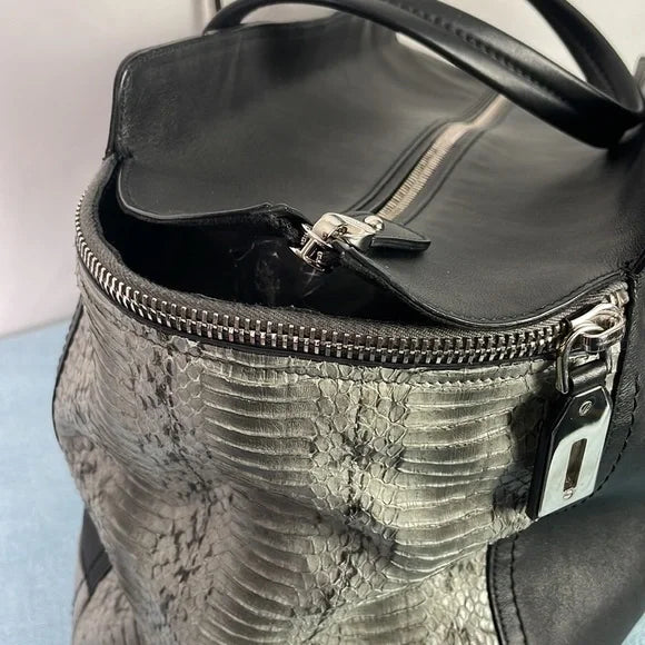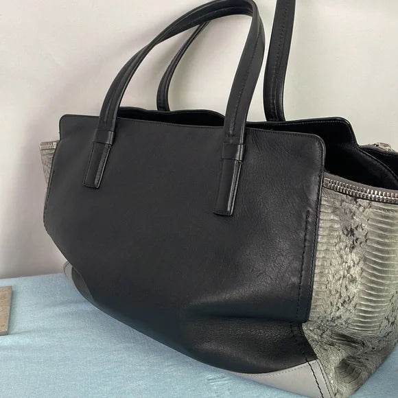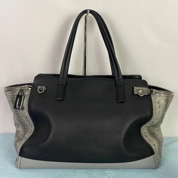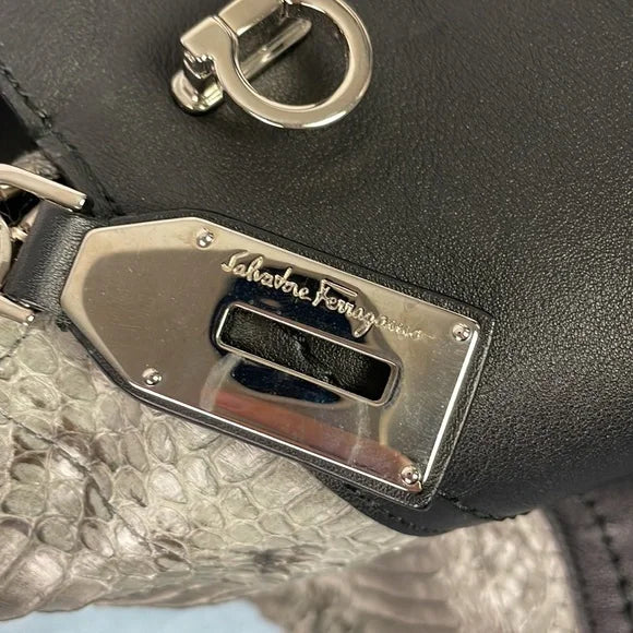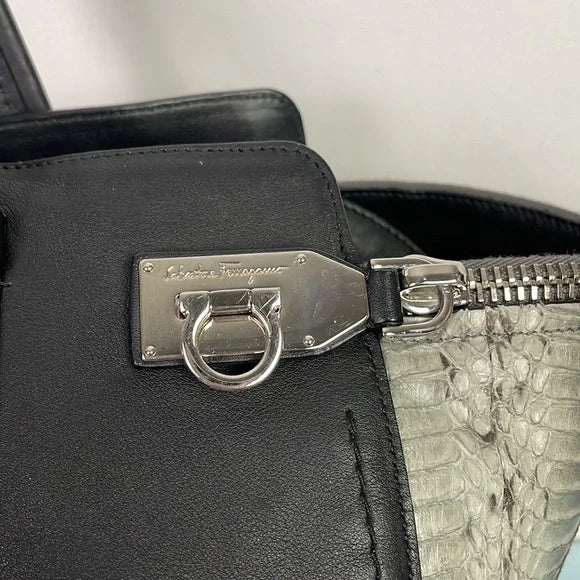 SALVATORE FERRAGAMO LARGE BLACK LEATHER AND GREY SNAKE BAG